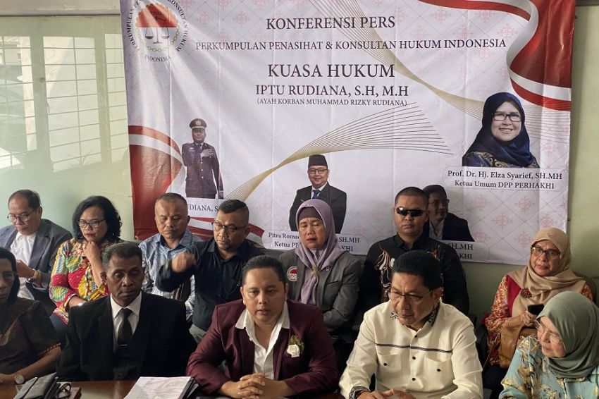 Kuasa hukum Iptu Rudiana Di Dewan Pengurus Pusat Perhimpunan Penasihat dan Konsultan Hukum Indonesia (DPP Perhakhi) Di konferensi pers Di Jakarta, Senin (22/7/2024). FOTO/MPI/RIYAN RIZKI ROSHALI