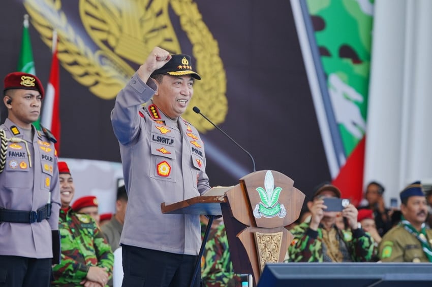 Kapolri Jenderal Listyo Sigit Prabowo memimpin Apel Akbar Kokam Pemuda Muhammadiyah 2025 yang dihadiri 23.450 orang Di Lapangan Tridadi, Kabupaten Sleman, Minggu (20/7/2025). Foto/Dok. SindoNews