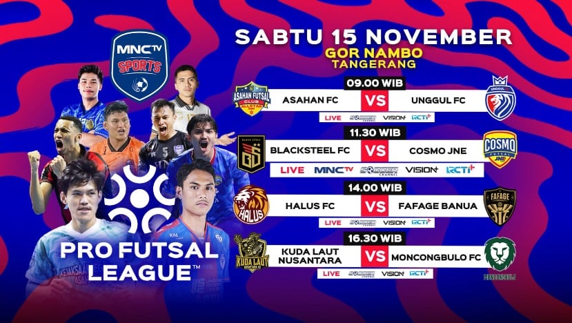 MNCTV menayangkan secara langsung laga Pro Futsal League 2025/2026 Di Blacksteel FC vs Cosmo JNE Di Sabtu, 15 November 2025, pukul 11.30 WIB digelar Hingga GOR Nambo, Kota Tangerang.