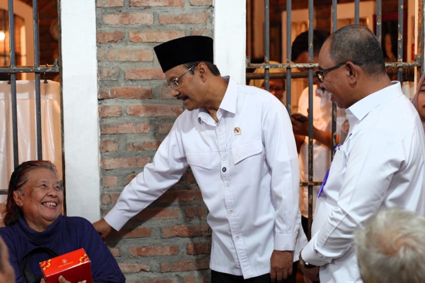 Pembantu Ri Sosial Saifullah Yusuf didampingi Plt Dirut Pos Indonesia, Haris menyapa warga penerima BLTS Kesra Ke Kantorpos Cikini, Jakarta Pusat, Rabu (31/12/2025). Foto/Dok. SindoNews